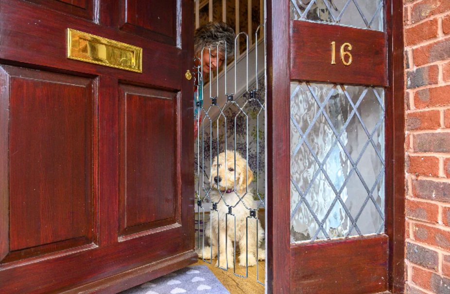 The front door safety gate. An extendable & durable retractable dog gate to be attached to any front door.